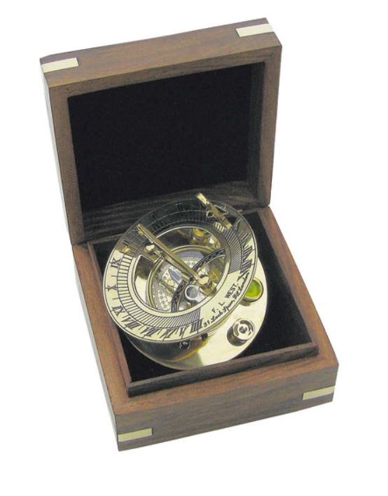 Messing Zonnewijzer met kompas in houten kistje 8cm Ø